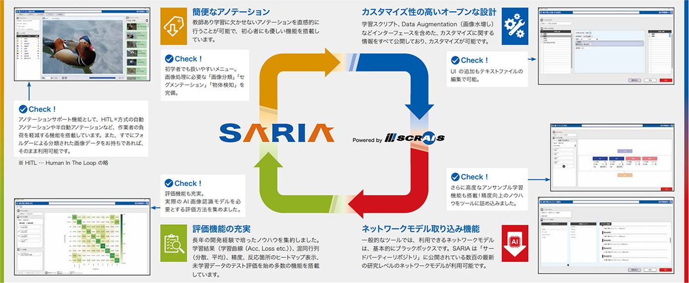 SARIAのコンセプトとして、AI初心者から上級者の方まで利用いただけるように、さまざまなユーザー向けの機能を搭載しています。初めて導入する方から、AI上級者の効率アップまで、役立つ機能を満載しています。