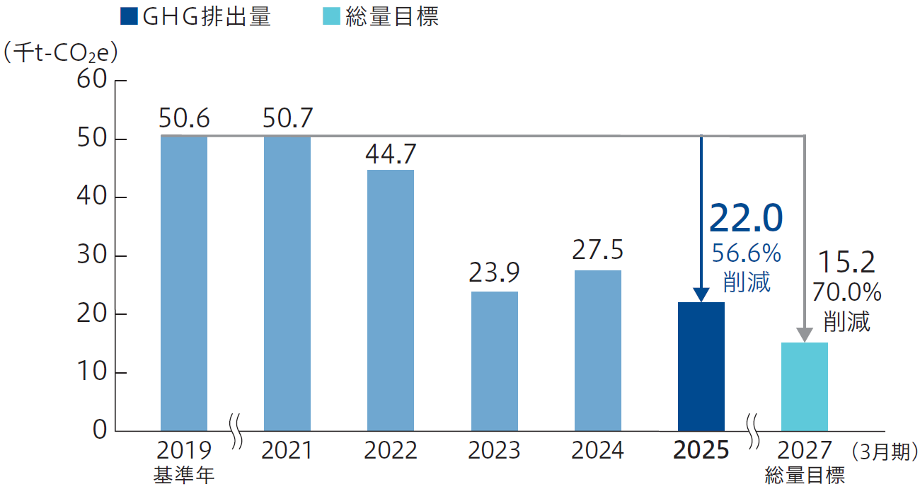 事業活動によるGHG排出量を、2027年3月期までに2019年3月期比 70.0%削減(総量)15.2千t-CO2e