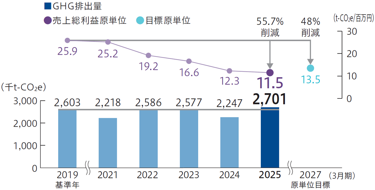 2025年3月期実績:2019年3月期比 55.7%削減(売上総利益原単位)11.5t-CO2e/百万円